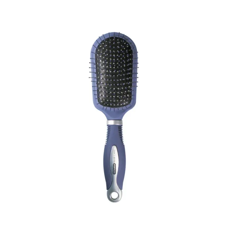 La Brosse Métallique Titania 1650 est un accessoire de coiffage robuste de couleur bleue, conçu pour offrir un démêlage puissant et efficace. Elle se caractérise par ses 11 rangées de picots métalliques robustes, solidement fixés sur un coussinet pneumatique souple. Cette structure permet à la brosse de s'adapter parfaitement à la forme du crâne lors du passage, offrant ainsi un massage stimulant du cuir chevelu tout en disciplinant la chevelure. Son manche ergonomique assure une prise en main ferme, idéale pour manipuler des cheveux difficiles ou volumineux.