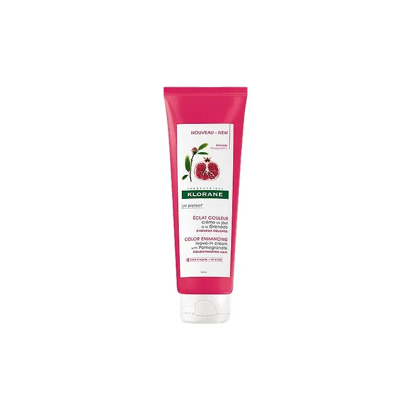 Crème de jour capillaire sans rinçage à la Grenade, elle nourrit, protège la couleur grâce à son filtre UV et révèle un éclat intense sur les cheveux colorés.