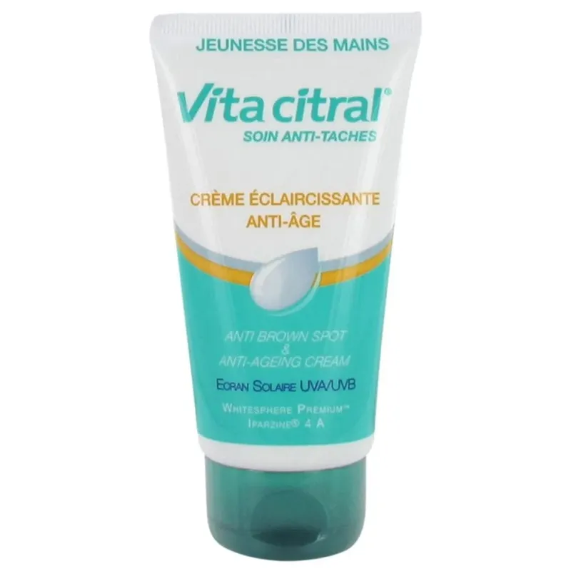 Crème éclaircissante mains VITA CITRAL 75 ML. Soin anti-âge et anti-taches qui atténue les taches brunes, raffermit et hydrate intensément la peau des mains, tout en protégeant contre les UV.