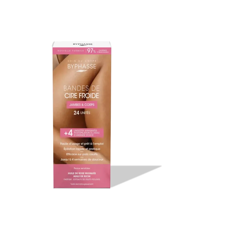 Les bandes de cire froide de Byphasse sont une solution d'épilation simple et rapide pour obtenir une peau lisse et douce. Ce pack contient 24 bandes de cire et 4 lingettes de finition, vous offrant tout ce dont vous avez besoin pour une épilation à la maison. La formule de la cire adhère fermement aux poils et non à la peau, garantissant une épilation efficace et un résultat net. Elles sont faciles à utiliser, ne nécessitent pas de chauffage et sont parfaites pour une retouche rapide et précise. Ce kit est idéal pour les jambes, le maillot et les aisselles, et procure une douceur qui dure jusqu'à quatre semaines.