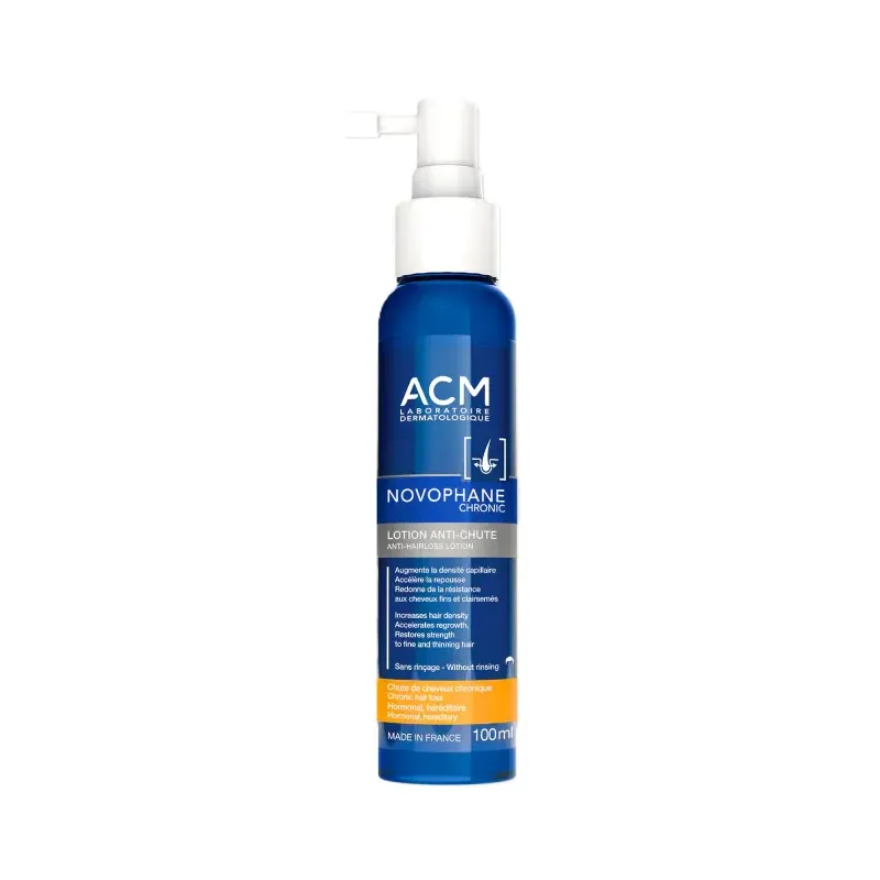 La Lotion Anti-Chute Chronique Novophane d'ACM est un soin intensif et quotidien développé pour freiner la chute de cheveux durable et stimuler la croissance de nouveaux cheveux. Elle est particulièrement indiquée pour les chutes de cheveux installées, héréditaires ou hormonales (alopécie androgénétique), mais aussi pour les chutes diffuses et persistantes.