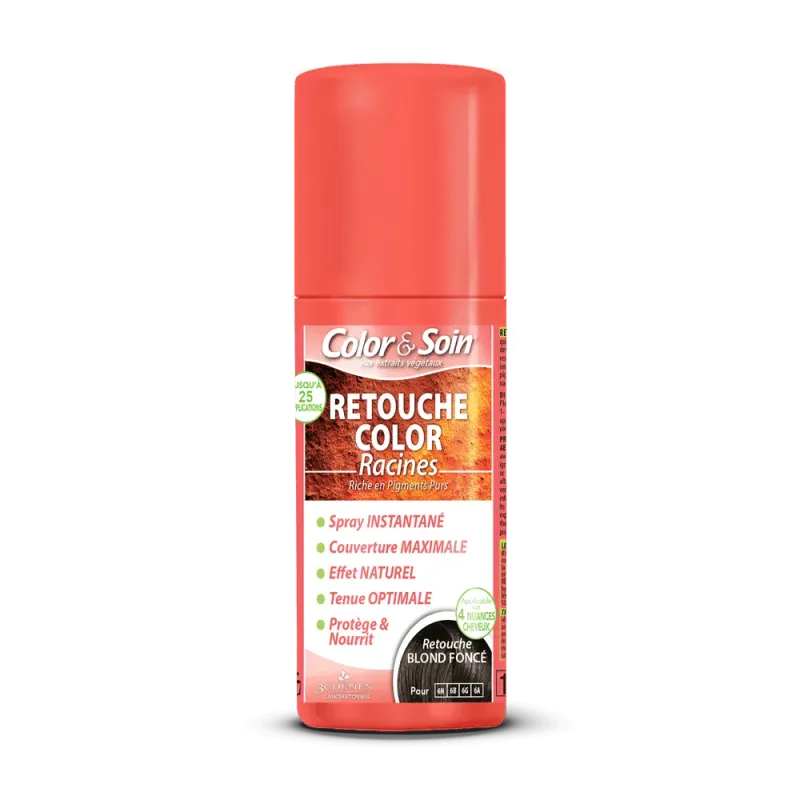 3 CHENES COLOR & SOIN SPRAY RETOUCHE BLOND FONCE 75 ML est un spray colorant instantané conçu pour masquer temporairement les racines apparentes et les cheveux blancs entre deux colorations. Il fait partie de la gamme Color & Soin des Laboratoires Les 3 Chênes, réputée pour ses formules plus respectueuses des cheveux.