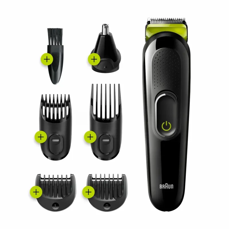 Le Braun Multi Grooming Kit MGK3221 est un kit de toilettage rechargeable conçu pour offrir 6 fonctions en 1 seul appareil. Il couvre l'essentiel du toilettage masculin : la tonte de la barbe, les finitions précises et l'élimination des poils du nez et des oreilles. Il intègre des lames affûtées inusables pour une efficacité durable et est fourni avec quatre sabots (deux fixes et deux réglables) permettant d'obtenir 13 réglages de longueur précis pour varier les styles de 0,5 mm à 21 mm. Ce modèle utilise une batterie Ni-MH qui offre une bonne autonomie pour les routines de toilettage rapides.