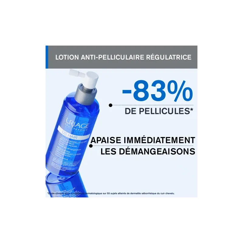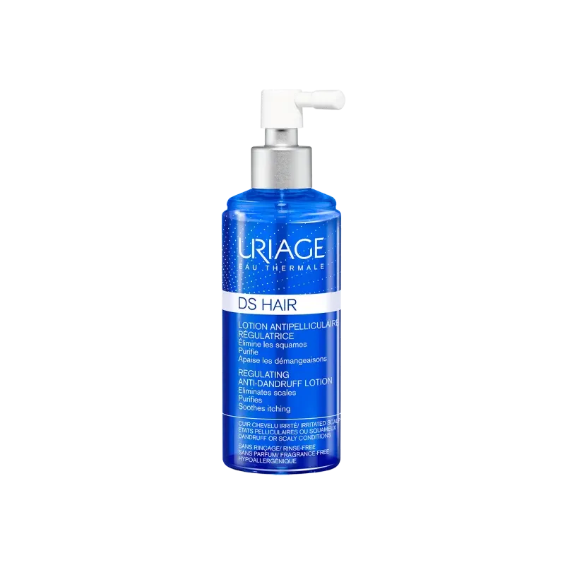 URIAGE D.S. HAIR Lotion Anti-Pelliculaire Régulatrice 100ml est un soin capillaire sans rinçage spécifiquement formulé pour les cuirs chevelus irrités, squameux et sujets aux pellicules, agissant pour apaiser les démangeaisons et réguler l'équilibre du cuir chevelu.