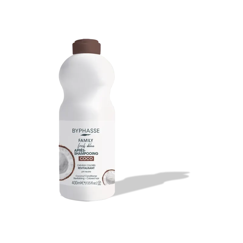 L'APRÈS-SHAMPOOING COCO CHEVEUX COLORÉS FAMILY FRESH DÉLICE BYPHASSE 400ML est un soin revitalisant conçu spécifiquement pour les cheveux colorés. Il fait partie de la gamme familiale de Byphasse, offrant un format généreux pour un usage fréquent. Cet après-shampoing a une double action : il facilite le démêlage tout en revitalisant et protégeant l'éclat de la coloration. Sa formule est enrichie en extrait de Noix de Coco (connue pour ses propriétés lissantes, démêlantes et réparatrices) et contient de l'hydro-kératine naturelle pour adoucir la fibre capillaire et la réparer. Il préserve la brillance et la souplesse des cheveux après chaque lavage. De plus, il est formulé avec un pH neutre pour la peau et est vegan.