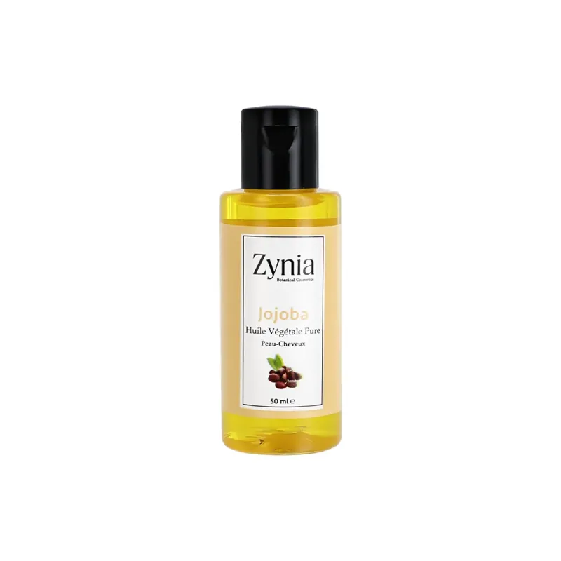 Huile végétale Zynia Pure de Jojoba (50 ml), cire liquide 100% pure, régulatrice de sébum et non comédogène, elle équilibre, hydrate et protège tous les types de peau et de cheveux, y compris les peaux grasses.