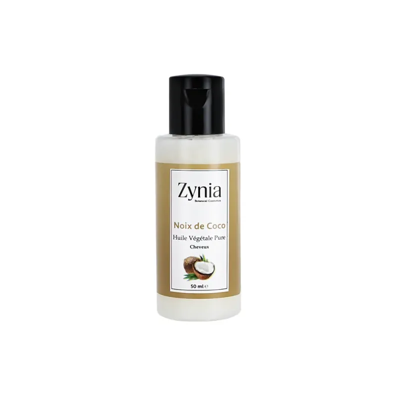 Huile végétale Zynia Pure de Noix de Coco (50 ml), 100% pure, essentielle pour l'hydratation et la fortification des cheveux secs et abîmés, ainsi que pour nourrir et apaiser les peaux sèches grâce à sa richesse en vitamines.