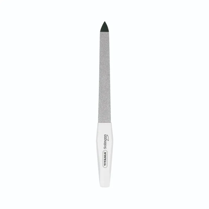 Lime à Ongles Titania 1040/5 est un instrument de manucure classique et robuste, conçu pour offrir une finition professionnelle aux ongles des mains et des pieds. Fabriquée en acier de haute qualité avec un revêtement saphir résistant, elle permet de raccourcir et de façonner les ongles avec une grande précision. Sa structure rigide est dotée de deux surfaces de grainage distinctes : une face à gros grains pour le façonnage initial et le dégrossissage, et une face à grains fins pour lisser les bords et prévenir le dédoublement de la kératine. Son manche ergonomique en plastique offre une prise en main stable, tandis que sa pointe fine est idéale pour nettoyer délicatement le dessous de l'ongle.