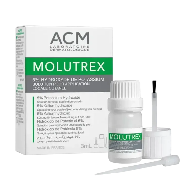 MOLUTREX est une solution cutanée pour le traitement local du molluscum contagiosum. Ce dispositif médical est destiné à être utilisé chez l'adulte et l'enfant à partir de 2 ans. Sa formule contient une solution d'hydroxyde de potassium (KOH) à 5%, un agent caustique puissant qui agit en détruisant les cellules infectées par le virus du molluscum. L'application ciblée de la solution sur chaque lésion entraîne une inflammation locale et la lyse (destruction) des cellules du molluscum, ce qui active une réponse immunitaire de l'organisme et permet l'élimination de l'infection. La solution est livrée avec un applicateur pour un traitement précis et hygiénique. MOLUTREX offre une solution efficace pour le traitement du molluscum contagiosum, en évitant les méthodes d'exérèse chirurgicale qui peuvent être douloureuses et invasives.