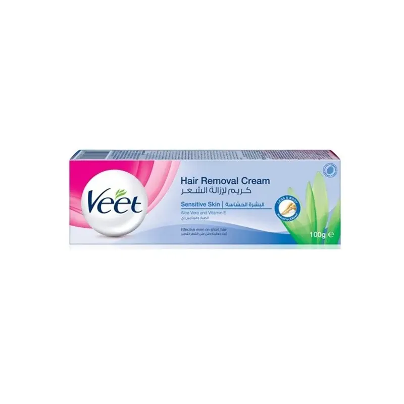 Crème dépilatoire Veet Silk & Fresh (100g) pour peaux sensibles, enrichie en Aloe Vera et Vitamine E, offrant une épilation rapide et indolore près de la racine avec un parfum plus agréable.