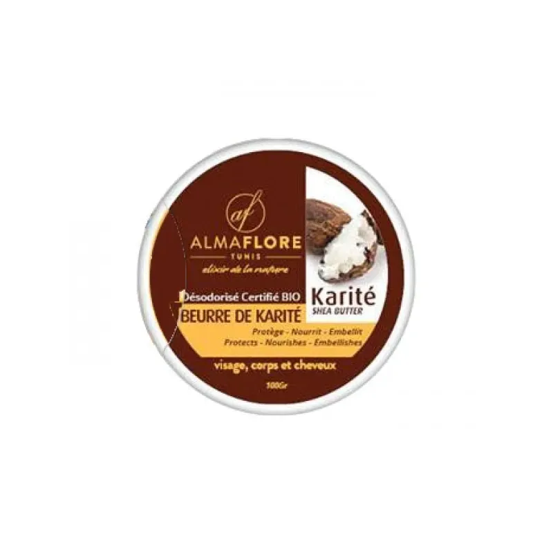 ALMAFLORE Beurre de Karité Désodorisé Certifié BIO 100 gr est un beurre végétal pur, extrait des noix du fruit du karité (Butyrospermum parkii). Contrairement au karité brut qui possède une odeur naturelle prononcée (souvent fumée ou noix), ce produit a été désodorisé à la vapeur d'eau. Ce processus doux permet d'éliminer l'odeur naturelle tout en préservant l'intégralité de ses propriétés intrinsèques : richesse en insaponifiables, en Vitamines A, D, E et F, et en acides gras essentiels. Il est Certifié BIO, garantissant une culture et une transformation respectueuses de l'environnement. Ce beurre est un soin protecteur, nourrissant et réparateur essentiel pour les peaux très sèches et les cheveux abîmés. Sa version désodorisée est idéale pour les personnes qui n'apprécient pas l'odeur du karité brut ou pour les préparations cosmétiques maison où l'on souhaite ajouter ses propres parfums (huiles essentielles, fragrances).