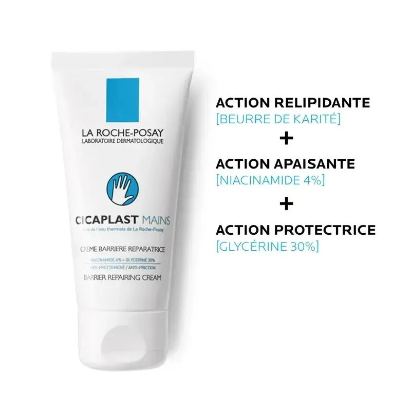La Roche-Posay Cicaplast Mains (50 ml) est une crème réparatrice quotidienne spécifiquement conçue pour les mains abîmées, sur-sollicitées, sèches, gercées ou irritées. Que ce soit en raison de l'exposition au froid, aux lavages fréquents, aux produits chimiques ou à des activités professionnelles intenses, cette crème barrière apporte une solution pour apaiser, réparer et protéger les mains les plus fragilisées.