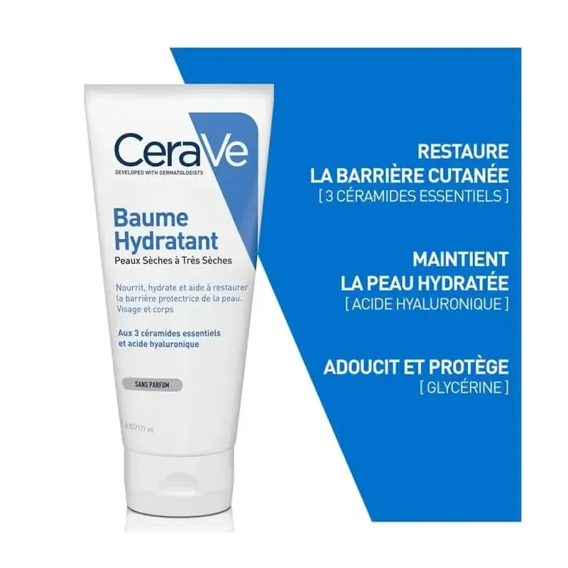 Le baume CeraVe hydrate intensément pendant 24 heures les peaux très sèches, restaure la barrière cutanée grâce aux 3 céramides essentiels et apporte un confort durable.