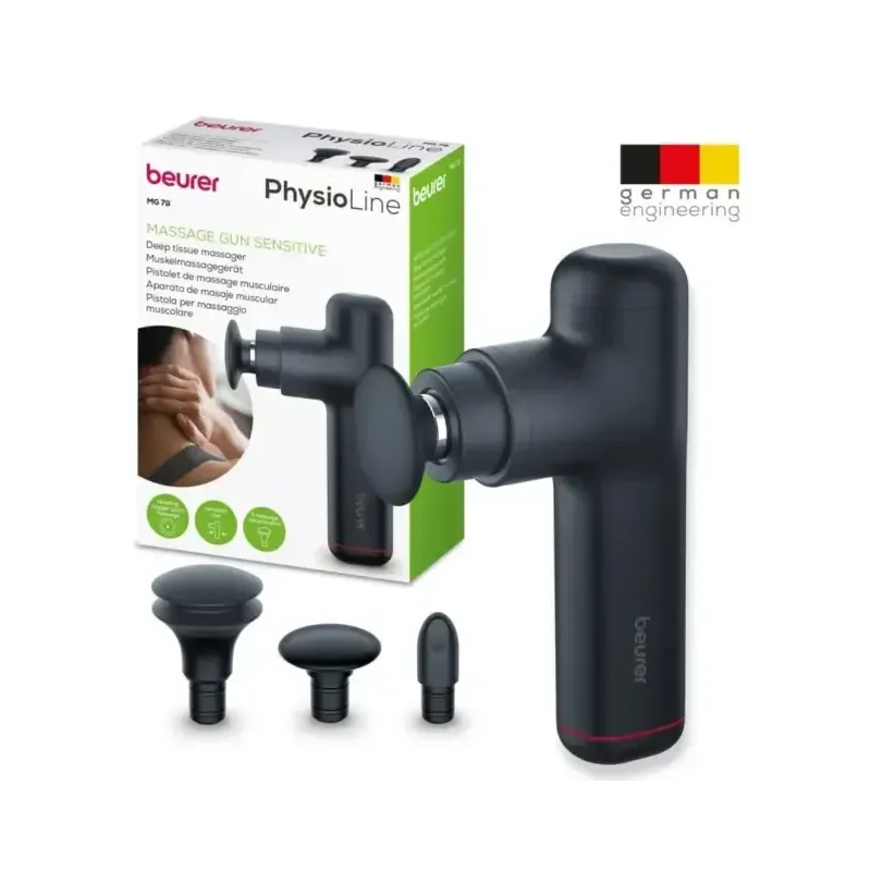 Pistolet de massage musculaire Beurer MG 79 (édition limitée) pour un massage doux et ciblé. Il offre 5 niveaux d'intensité et est fourni avec 4 embouts de massage. Il est compact, léger et idéal pour la relaxation et la récupération musculaire.