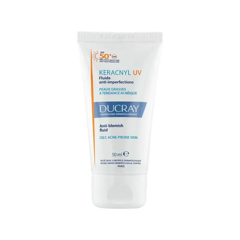 Le DUCRAY KERACNYL UV FLUIDE ANTI IMPERFECTIONS SPF50 50ML est un soin solaire double action formulé spécifiquement pour les peaux grasses à tendance acnéique. Il offre une Très Haute Protection Solaire (SPF50+) contre les rayons UVA et UVB, indispensable pour prévenir les dommages du soleil et, surtout, pour limiter l'effet rebond (la réapparition et l'aggravation des imperfections après l'arrêt de l'exposition solaire). En parallèle, sa formule enrichie en actifs spécifiques agit sur l'origine des imperfections pour favoriser leur élimination, réduire la production de sébum, et offrir un fini mat durable. Sa texture fluide et légère est non comédogène et pénètre rapidement sans laisser de film gras ou de traces blanches.