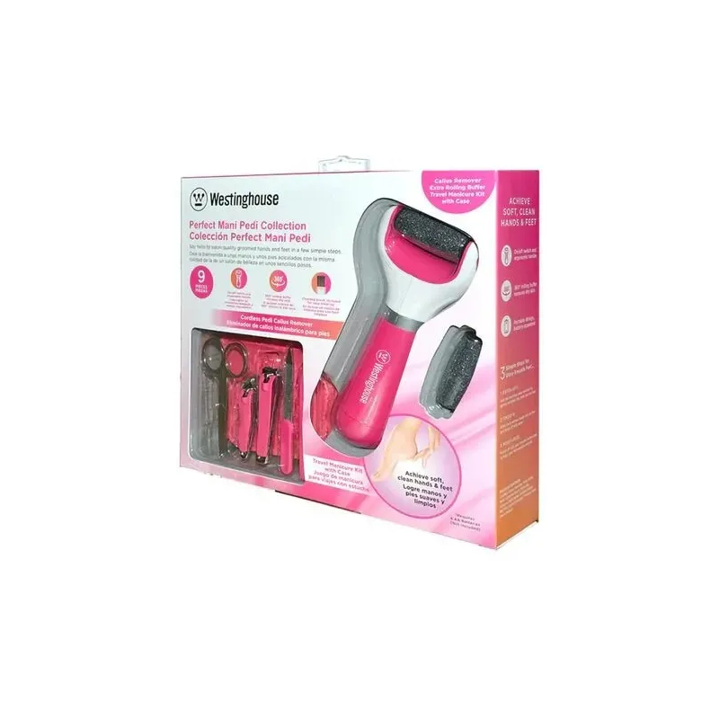 Le SET WESTINGHOUSE est un ensemble complet de neuf pièces conçu pour un soin professionnel des pieds, des mains et des ongles à domicile. Il combine une râpe électrique performante pour l'exfoliation des pieds et une trousse de manucure pédicure avec accessoires. Le cœur de ce kit est la râpe électrique qui élimine efficacement les peaux dures et les callosités grâce à son tampon roulant rotatif à trois cent soixante degrés. L'ensemble permet d'obtenir des pieds doux et des ongles soignés en seulement quelques minutes. Livré dans un étui de voyage pratique, ce kit est l'allié idéal pour l'entretien régulier des extrémités.