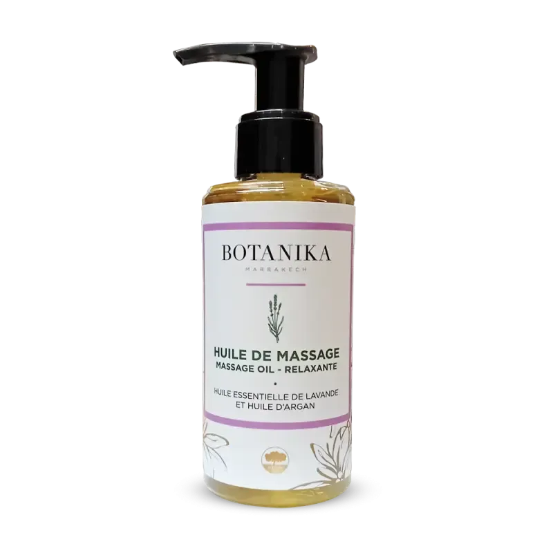 Huile de massage Relaxante (150ml) BOTANIKA, enrichie en huiles d'argan, amande douce, sésame et Huile essentielle de Lavande. Elle hydrate, adoucit la peau et procure une véritable expérience de détente et anti-stress, idéale pour relâcher les tensions.
