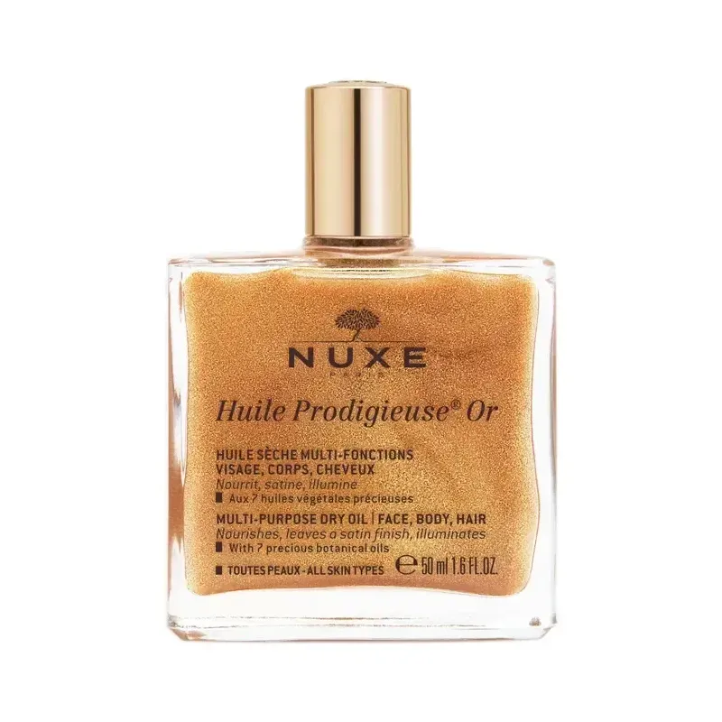 Cette huile sèche multi-fonctions, à la formule scintillante, est un soin culte qui nourrit, répare et sublime la peau et les cheveux en un seul geste. Enrichie en sept huiles végétales précieuses (Tsubaki, Amande douce, Camélia, Bourrache, Noisette, Macadamia et Argan), sa texture ultra-sensorielle pénètre instantanément sans laisser de film gras. Les fines nacres d'origine naturelle illuminent la peau et les cheveux d'un éclat subtil et irisé. Sur le corps, elle laisse la peau satinée et lumineuse, tandis que sur les cheveux, elle les rend brillants et doux. Son parfum mythique aux notes de fleur d'oranger, magnolia et vanille en fait un produit culte, parfait pour prolonger le soleil toute l'année.