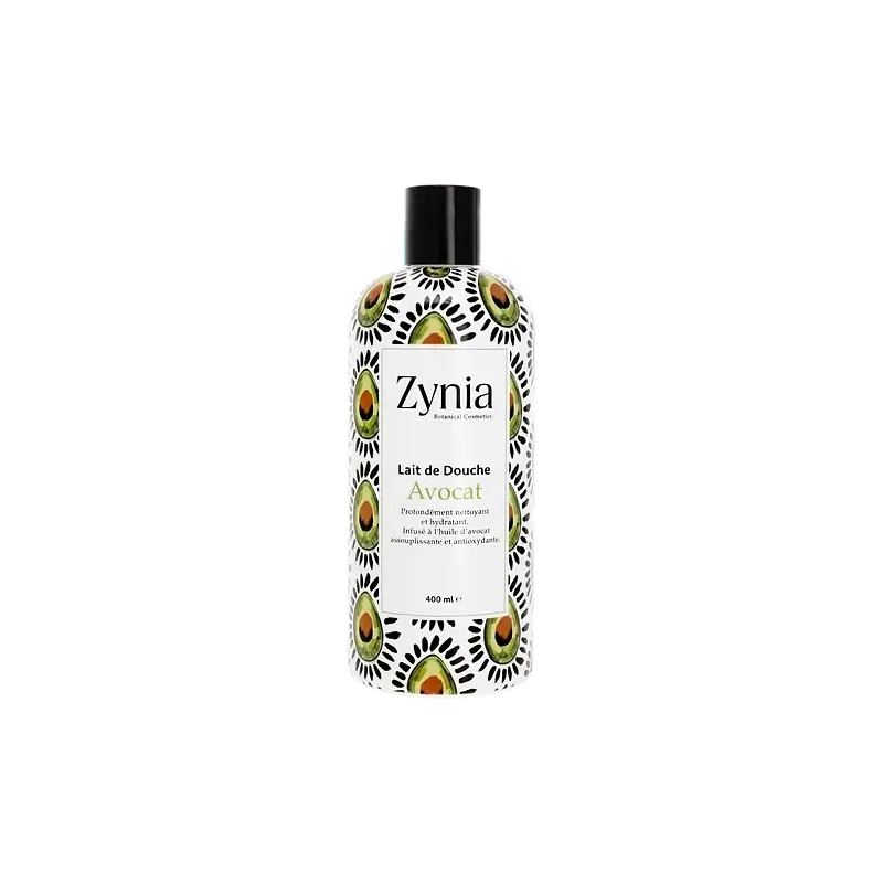 Lait de douche Zynia Avocat (400 ml), enrichi en huile d'avocat nourrissante, il nettoie délicatement la peau tout en lui apportant hydratation et souplesse, idéal pour les peaux sèches.