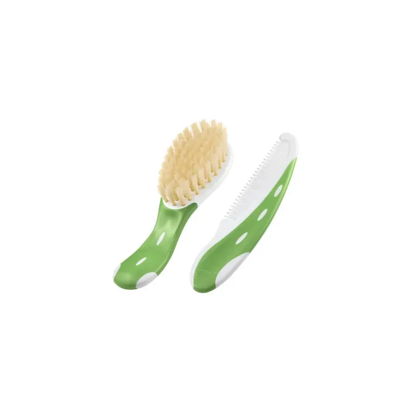 Cet ensemble brosse et peigne NUK, sans BPA, est conçu pour coiffer délicatement les cheveux de bébé. La brosse à poils ultra-doux masse le cuir chevelu sensible, tandis que le peigne à dents arrondies démêle sans irriter. C'est le duo parfait pour le soin quotidien et hygiénique des cheveux fins des nourrissons.