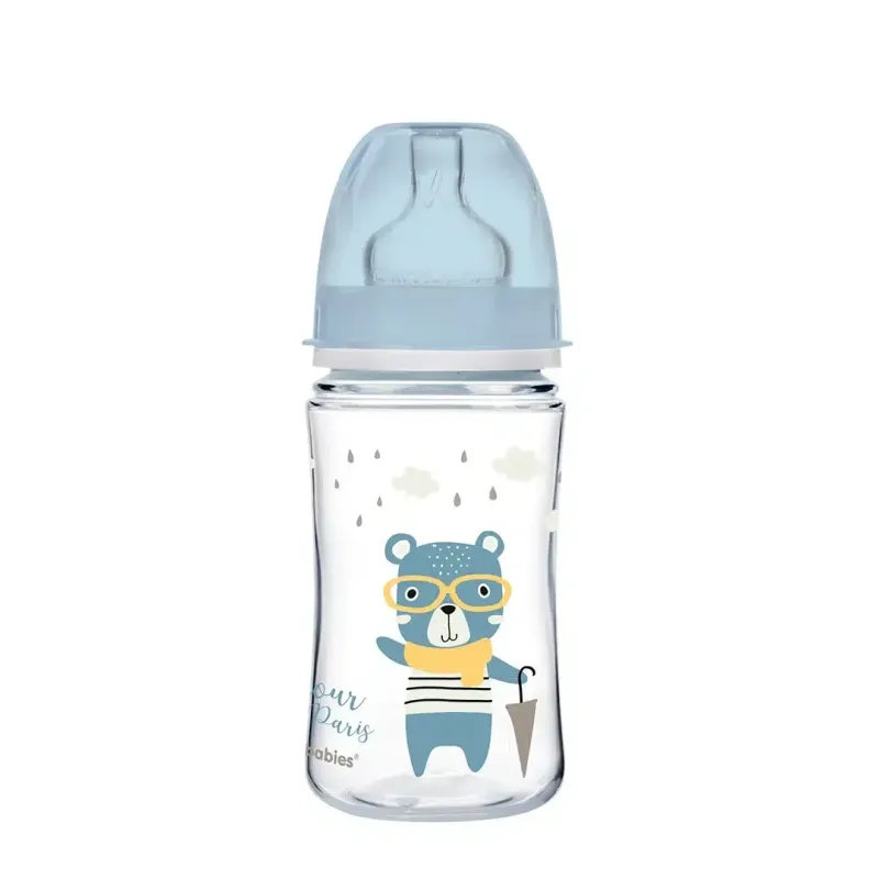 Un biberon anticolique Canpol Babies de 240 ml en polypropylène sans BPA, au design "Bonjour Paris" avec un col large et une tétine en silicone, conçu pour réduire les coliques et faciliter le nettoyage, idéal pour les bébés dès la naissance.