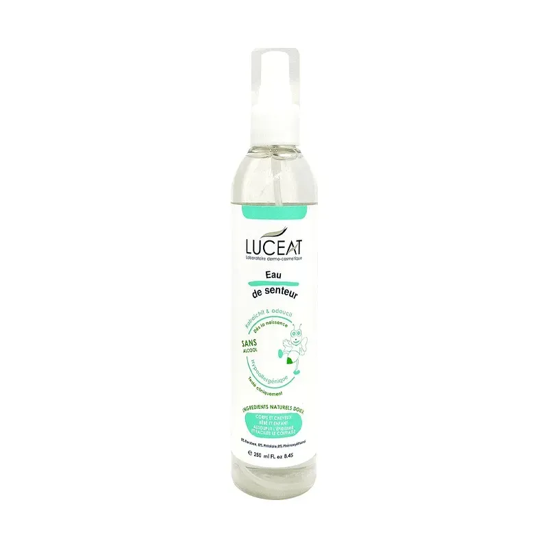 Eau de Senteur LUCEAT 250ml, formule hypoallergénique et sans alcool pour bébé, rafraîchit, adoucit et parfume délicatement la peau et les cheveux avec un parfum doux et léger.