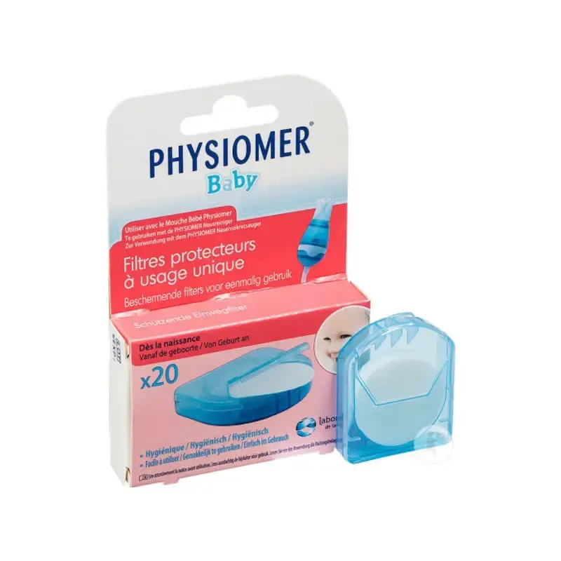 Recharge de 20 filtres protecteurs jetables pour le Mouche Bébé PHYSIOMER. Ils garantissent une hygiène parfaite et une sécurité optimale en empêchant le contact entre les mucosités de bébé et le parent, tout en protégeant l'appareil.