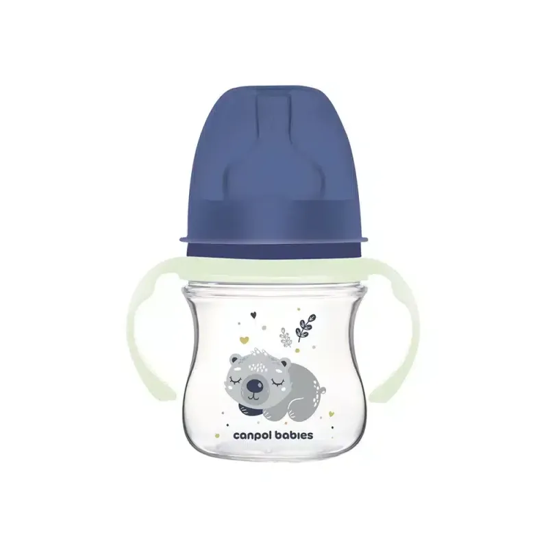 Un biberon anticolique Canpol Babies de 120 ml en polypropylène sans BPA, avec une tétine en silicone à débit lent, parfait pour réduire les coliques et offrir une tétée confortable aux nouveau-nés (0 mois et plus) dès la naissance.