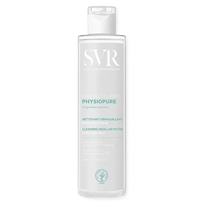 L'eau micellaire PHYSIOPURE de SVR est un soin nettoyant et démaquillant ultra-doux, spécialement conçu pour les peaux sensibles. Sa formule minimaliste, sans alcool, sans savon et sans parfum, est enrichie en magnésium oxygénant, un oligo-élément marin essentiel qui revitalise et détoxifie la peau. Les micelles, de petites sphères de tensioactifs, agissent comme des aimants pour capter et éliminer en douceur le maquillage (même waterproof), les impuretés et les particules de pollution, sans frotter ni irriter la peau. Cette eau micellaire respecte l'équilibre naturel de la peau et ne la dessèche pas, la laissant parfaitement propre, fraîche et apaisée. Elle ne nécessite pas de rinçage, ce qui la rend rapide et pratique d'utilisation.