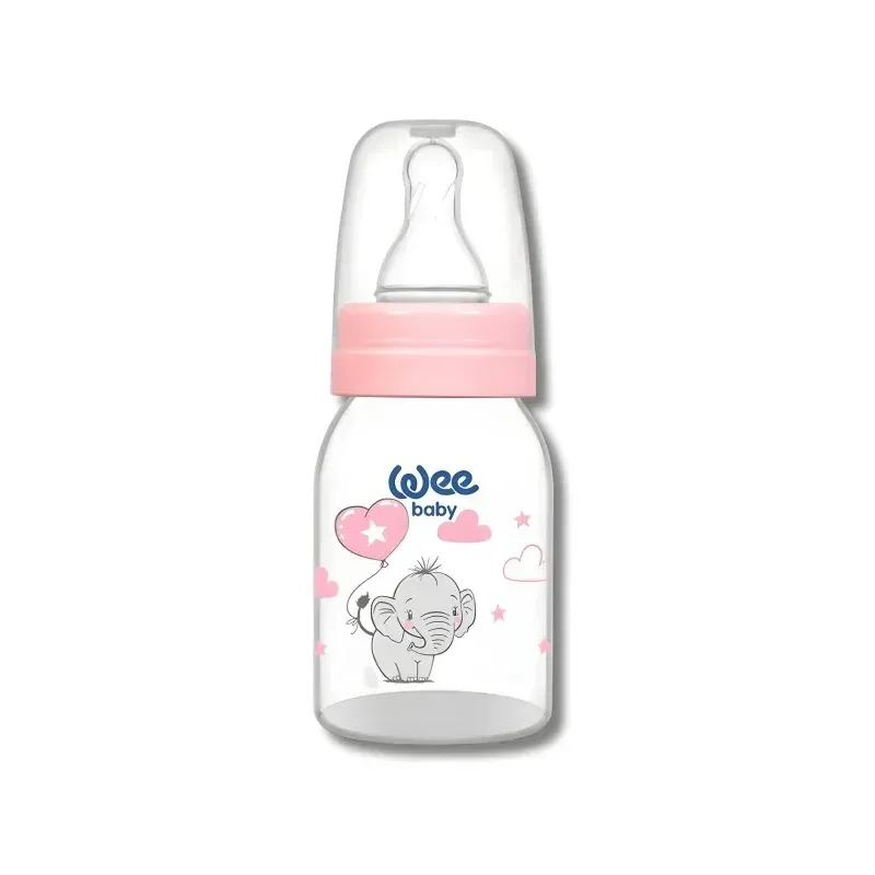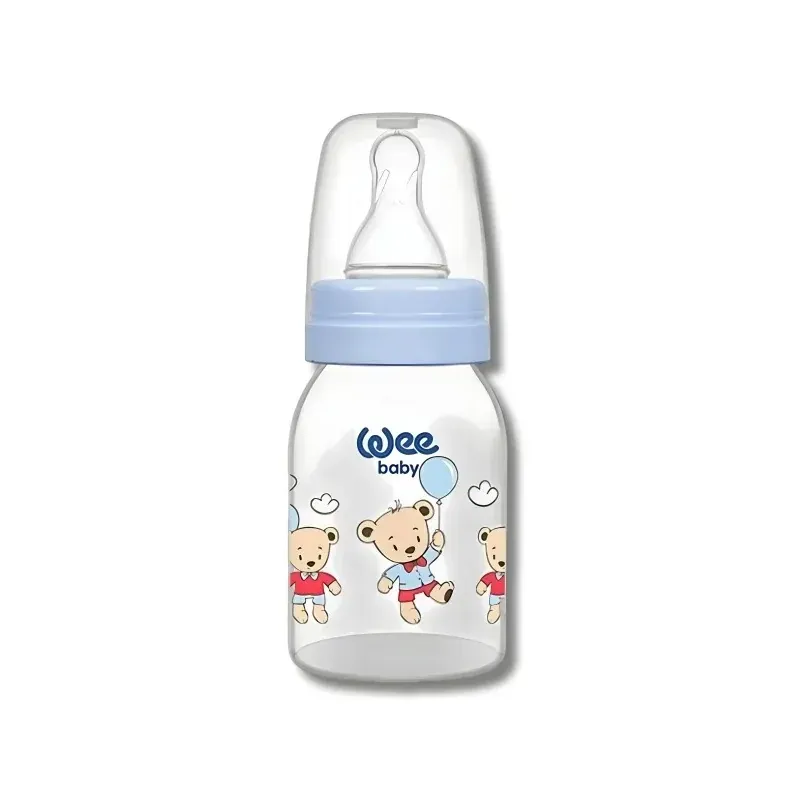 Un biberon Wee Baby pour les bébés de 0 à 6 mois. Ce biberon de 125 ml, fabriqué en plastique sans BPA, a une forme proche du sein pour faciliter la transition avec l'allaitement. Il est doté d'une tétine en silicone souple pour une tétée naturelle et pour aider à réduire les coliques.