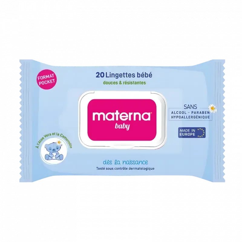 Les lingettes bébé Materna Bleu sont des lingettes douces et épaisses, présentées en boîte de 20. Elles sont hypoallergéniques, sans alcool et sans parabène, parfaites pour la toilette de bébé en déplacement.