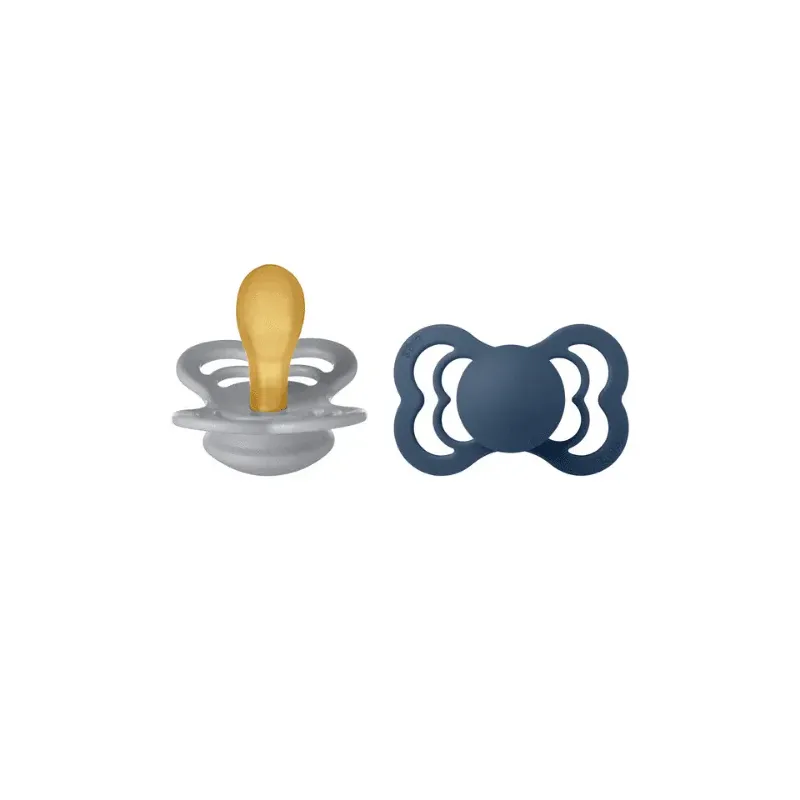 Lot de deux sucettes BIBS Taille 2 (Cloud et Steel Blue), elles se distinguent par leur design élégant et leur couleur tendance, offrant confort et sécurité aux bébés plus âgés.