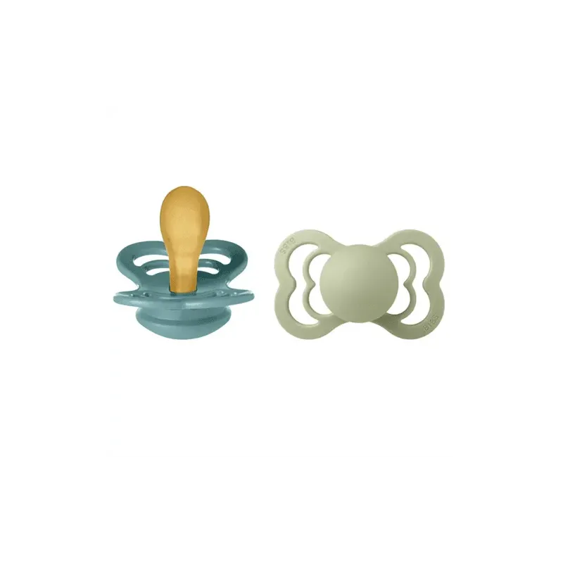 Lot de deux sucettes BIBS Supreme Taille 2 (Island Sea et Sage), elles offrent une téterelle symétrique et plate en silicone pour un développement buccal sain et une collerette ajourée pour le confort des bébés plus âgés.