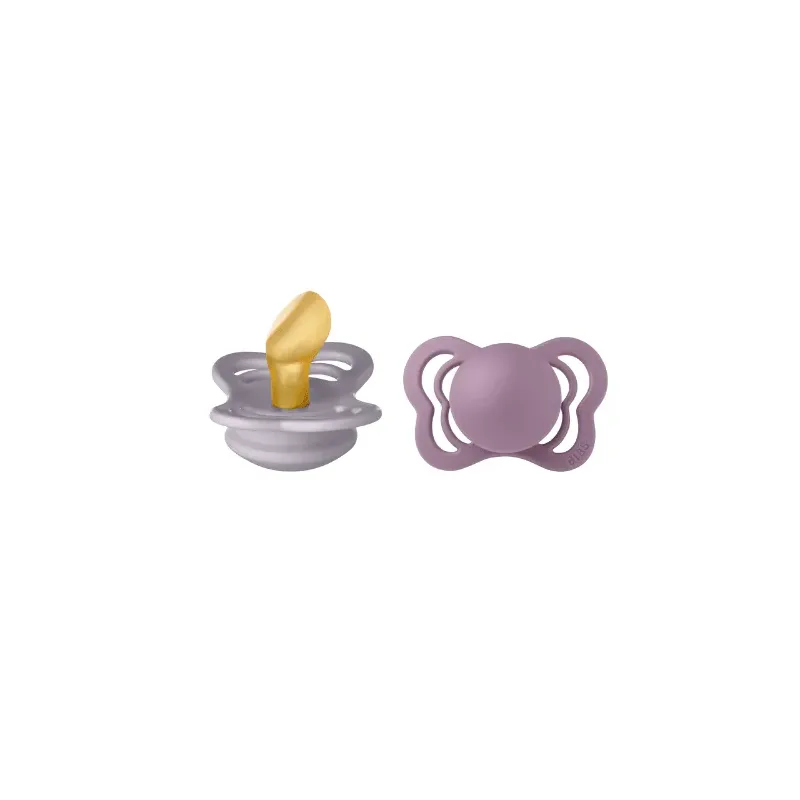 Lot de deux sucettes BIBS Couture Taille 1 (Fossil Grey et Mauve), elles se distinguent par leur design papillon et leur téterelle anatomique, idéales pour le développement de la mâchoire des nouveau-nés.