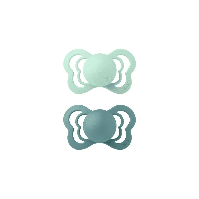 Lot de deux sucettes BIBS Couture Taille 2 (Nordic Mint et Island Sea), elles se distinguent par leur design papillon et leur téterelle anatomique, idéales pour le développement de la mâchoire des bébés plus âgés.