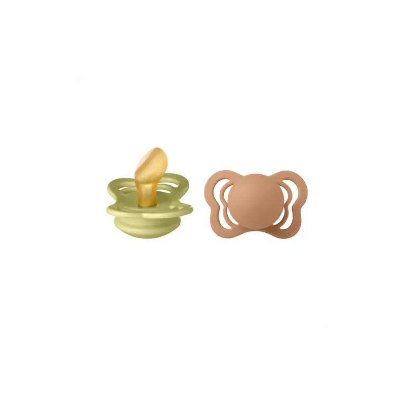 Ce produit est un lot de deux sucettes (tétines) de la collection BIBS Couture, qui se distingue par son design élégant en forme de papillon et sa tétéeelle anatomique. Elles sont présentées dans un mélange de coloris inspirés par la nature : Meadow (Prairie, un vert tendre et clair) et Earth (Terre, une nuance de brun ou de beige terreux neutre). La caractéristique principale de cette sucette est sa collerette en forme de papillon, conçue pour suivre le contour du visage du bébé. La téterelle est de forme orthodontique (anatomique), imitant la forme du palais du bébé pour réduire la pression sur les dents et la mâchoire. Ces sucettes sont de taille 1, ce qui les destine aux nouveau-nés et aux jeunes bébés (généralement 0-6 mois). La téterelle est souvent fabriquée en silicone médical pour les modèles Couture, mais la gamme existe également en latex naturel (il est conseillé de vérifier l'emballage exact).