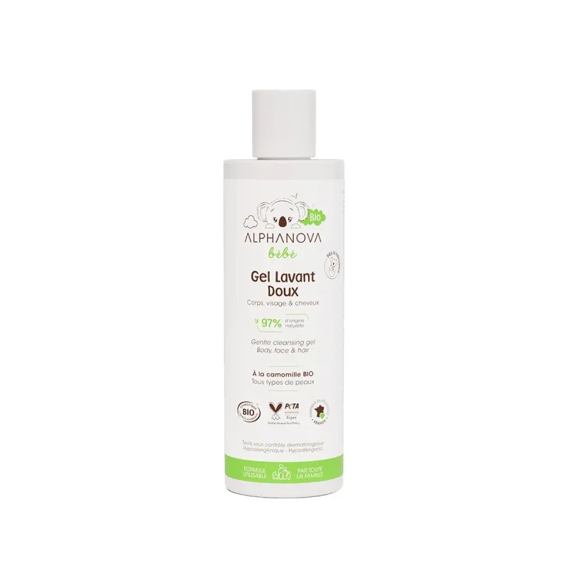 Le Alphanova Gel Lavant Doux Bio 200ml est un soin d'hygiène 2-en-1 (corps et cheveux) certifié biologique, formulé sans savon ni sulfate pour nettoyer ultra-doucement la peau sensible de bébé et de toute la famille, tout en assurant une bonne hydratation.