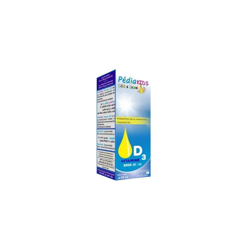 VITAL Pediakids Vitamine D3 35ml est un complément alimentaire sous forme de solution buvable (gouttes), spécifiquement formulé pour apporter la dose nécessaire de Vitamine D3 aux nourrissons et jeunes enfants. La vitamine D3 est essentielle pour la croissance et le développement osseux, ainsi que pour le bon fonctionnement du système immunitaire.