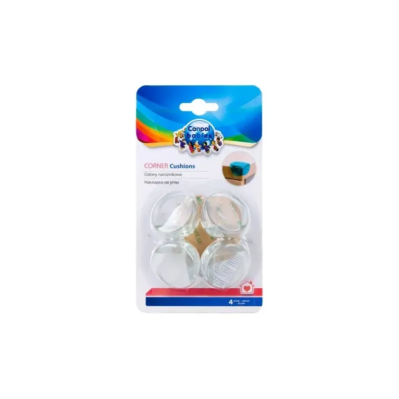 Un lot de 4 protections de coins Canpol Babies souples et transparentes, conçues pour amortir les chocs et sécuriser les angles vifs des meubles, offrant une protection essentielle pour les bébés explorateurs.