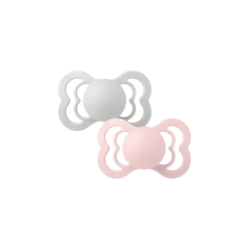 Lot de deux sucettes BIBS Supreme Taille 1 (Haze et Blossom), elles offrent une téterelle symétrique et plate en silicone pour un développement buccal sain et une collerette ajourée pour le confort des nouveau-nés.
