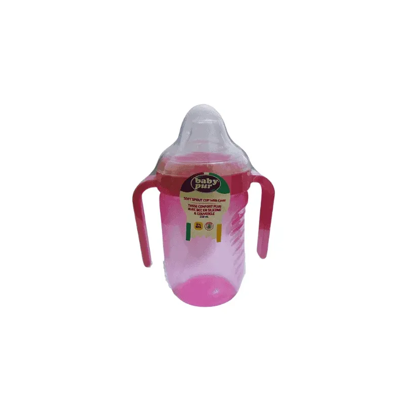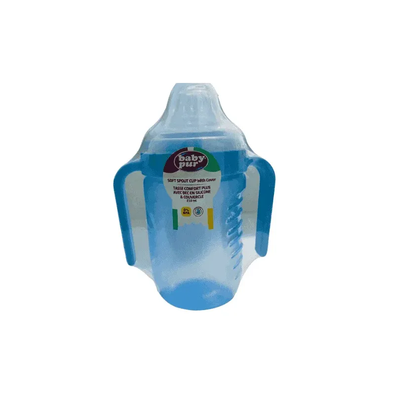 La Tasse Confort+ de BABY PUR, d'une capacité de 210 ml, est l'accessoire parfait pour accompagner le bébé dans la transition du biberon au verre. Généralement recommandée à partir de 6 mois, elle est conçue pour l'apprentissage de la boisson en autonomie. La tasse est dotée d'un bec verseur en silicone souple qui est doux pour les gencives sensibles et imite la forme de la tétine. Son mécanisme intègre une valve anti-fuite intelligente, garantissant que le liquide ne s'écoule que lorsque l'enfant exerce une succion. Le corps de la tasse est muni de poignées ergonomiques latérales adaptées aux petites mains, facilitant la prise en main et la manipulation par bébé. Un couvercle de protection transparent vient compléter l'ensemble pour une hygiène optimale lors du transport.