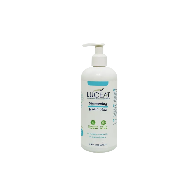 Shampooing et Bain Bébé LUCEAT 400ml, soin 2-en-1 ultra-doux au pH physiologique, nettoie sans dessécher ni piquer les yeux, adapté à l'hygiène quotidienne du corps et des cheveux des nourrissons.