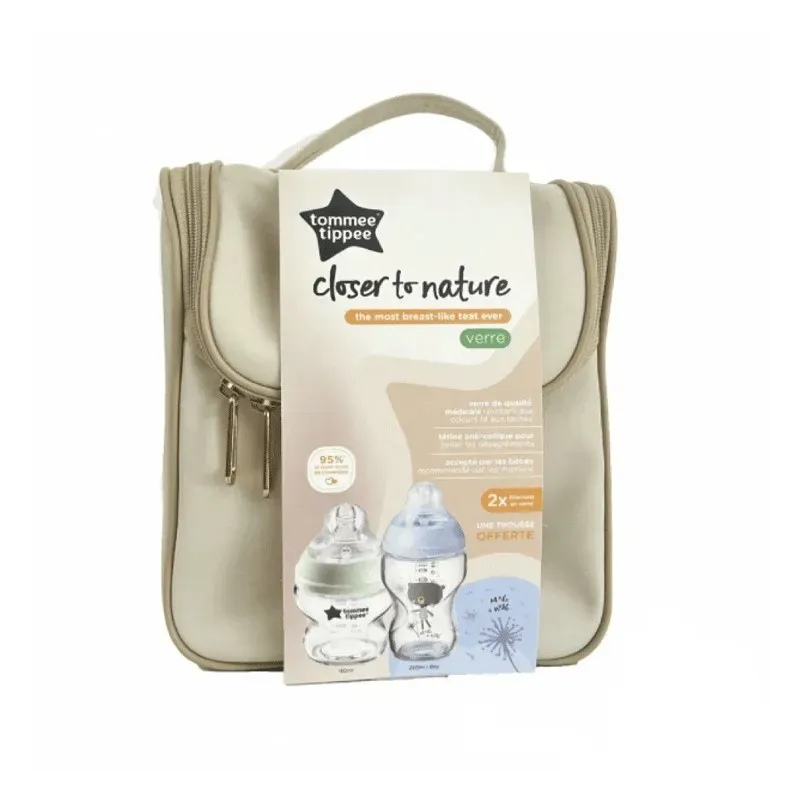 La Trousse Closer to Nature 02 Biberons en Verre Bleu de Tommee Tippee est un ensemble d'allaitement essentiel, idéal pour les nouveau-nés et les parents soucieux de l'environnement et de la sécurité. Cette trousse contient généralement deux biberons en verre de la gamme Closer to Nature, souvent de tailles différentes (ex: 150 ml et 250/260 ml), accompagnés d'une trousse/vanity offerte pour faciliter le transport ou le rangement. Le choix du verre borosilicate confère aux biberons une grande durabilité et assure une hygiène optimale, car il ne retient ni les odeurs, ni les taches. Ces biberons sont conçus pour imiter le sein maternel et faciliter la transition entre le sein et le biberon grâce à leur tétine unique. La couleur bleue ajoute une touche esthétique.