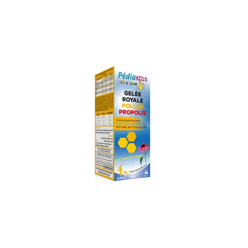 Le VITAL Pediakids Gelée Royale Pollen Propolis 150ml est un complément alimentaire sous forme de solution buvable, spécialement formulé pour les enfants afin de soutenir et de renforcer leurs défenses immunitaires. Il combine les bienfaits de trois précieux produits de la ruche, reconnus pour leurs propriétés nutritives, protectrices et revitalisantes.