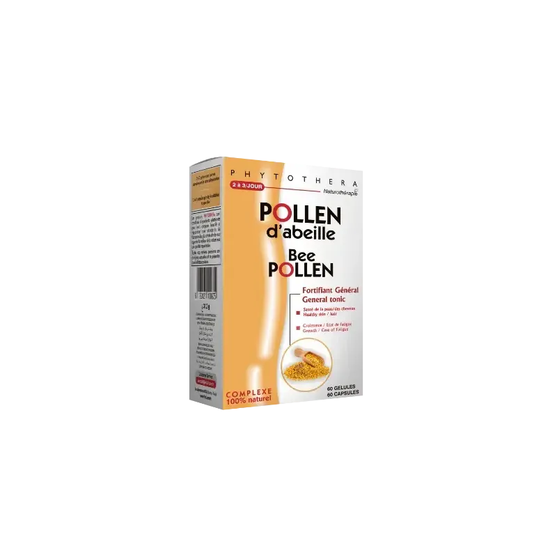 VITAL PHYTOTHERA POLLEN D'ABEILLES 60 GÉLULES est un complément alimentaire naturel, riche en nutriments, idéal pour les personnes en quête de vitalité et de renforcement de l'organisme. Le pollen d'abeilles est un super-aliment qui contient une grande variété de vitamines, minéraux, acides aminés et enzymes. Ce complément est un allié précieux pour combattre la fatigue, soutenir le système immunitaire et améliorer le bien-être général, particulièrement lors des changements de saison, de surmenage ou de convalescence.