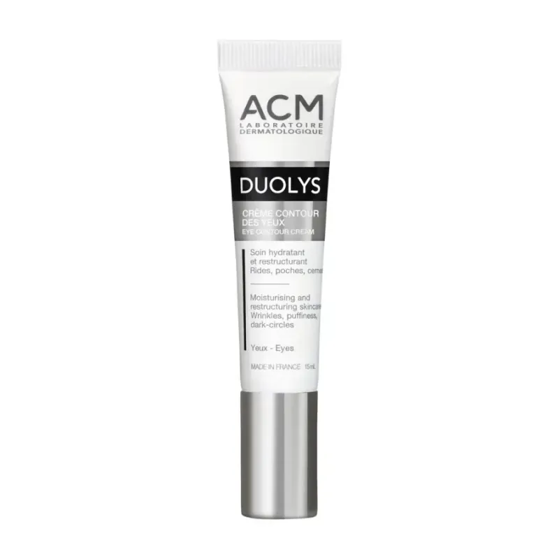 Le soin DUOLYS CONTOUR DES YEUX d'ACM est un traitement anti-âge et anti-fatigue spécialement conçu pour la zone délicate du contour des yeux. Sa formule, à la fois hydratante et correctrice, agit sur les signes de l'âge et les marques de fatigue : rides, ridules, poches et cernes. Il est enrichi en vitamine C stabilisée et en vitamine E, deux puissants antioxydants qui protègent la peau des agressions extérieures et du vieillissement prématuré. Le soin contient aussi des actifs drainants et décongestionnants qui agissent sur les poches et les cernes pour un regard plus reposé et lumineux. Sa texture gel-crème, légère et non grasse, pénètre rapidement, offrant un confort immédiat et laissant la peau douce, apaisée et hydratée. Utilisé au quotidien, il lisse les rides, réduit les poches et éclaircit les cernes pour un regard visiblement plus jeune et plus lumineux.