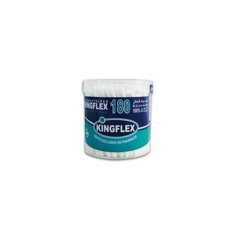 Bâtonnets ouatés KINGFLEX, en boîte de 180 pièces, fabriqués avec 100% de coton pur sur une tige flexible, pour une hygiène quotidienne douce, précise et polyvalente.