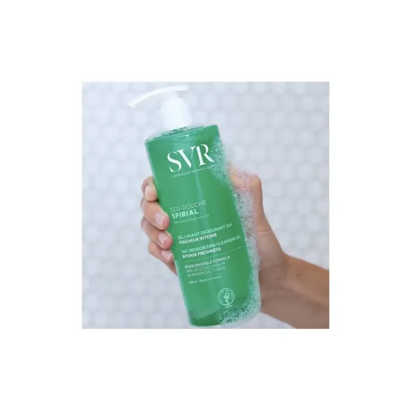 Le gel lavant déodorant SPIRIAL DÉO-DOUCHE de SVR est un soin nettoyant 2-en-1, idéal pour un usage quotidien du visage, du corps, des cheveux et même de l'hygiène intime. Spécialement formulé pour les peaux sensibles, il offre une action déodorante efficace pendant 24 heures, tout en nettoyant la peau en douceur. Sa formule, enrichie en agents doux et en probiotiques, aide à maintenir l'équilibre de la flore cutanée et à prévenir les mauvaises odeurs. Il n'est pas un anti-transpirant, mais un nettoyant déodorant qui neutralise les odeurs de transpiration tout en respectant l'équilibre de la peau. Sa mousse onctueuse se rince facilement et laisse la peau propre, fraîche et délicatement parfumée, avec une sensation de confort immédiate.