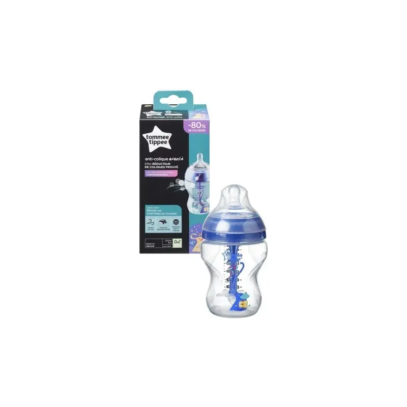 Biberon Advanced Anti-Colique Tommee Tippee bleu (260 ml, 0M+) avec tétine débit lent imitant le sein et système de ventilation anti-colique avancé, conçu pour réduire l'ingestion d'air et apaiser les troubles digestifs du nouveau-né.