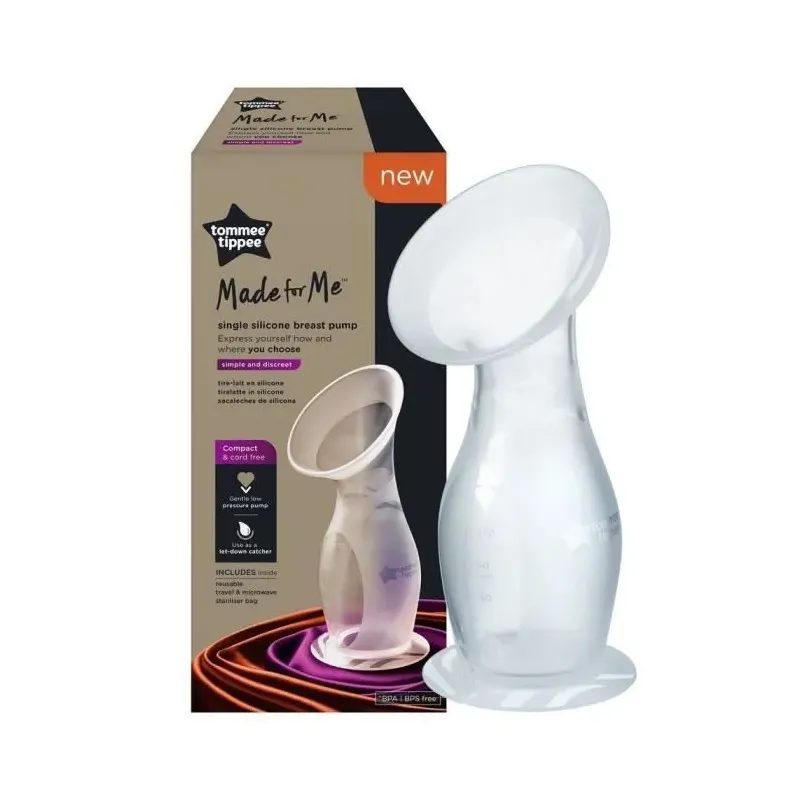 Tire-Lait Nomade en Silicone Tommee Tippee Made for Me, outil 3-en-1 en silicone pur et sans BPA, conçu pour recueillir les fuites et soulager l'engorgement grâce à une aspiration douce et mains-libres.